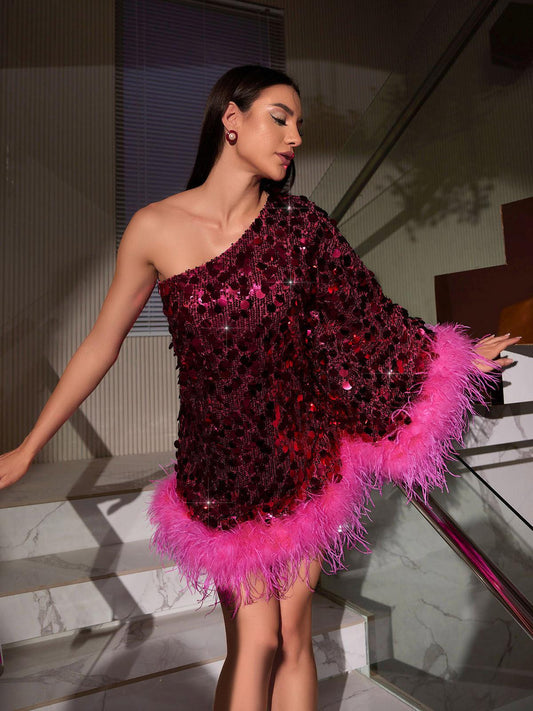 Ceridwen One Shoulder Feather Sequin Mini Dress