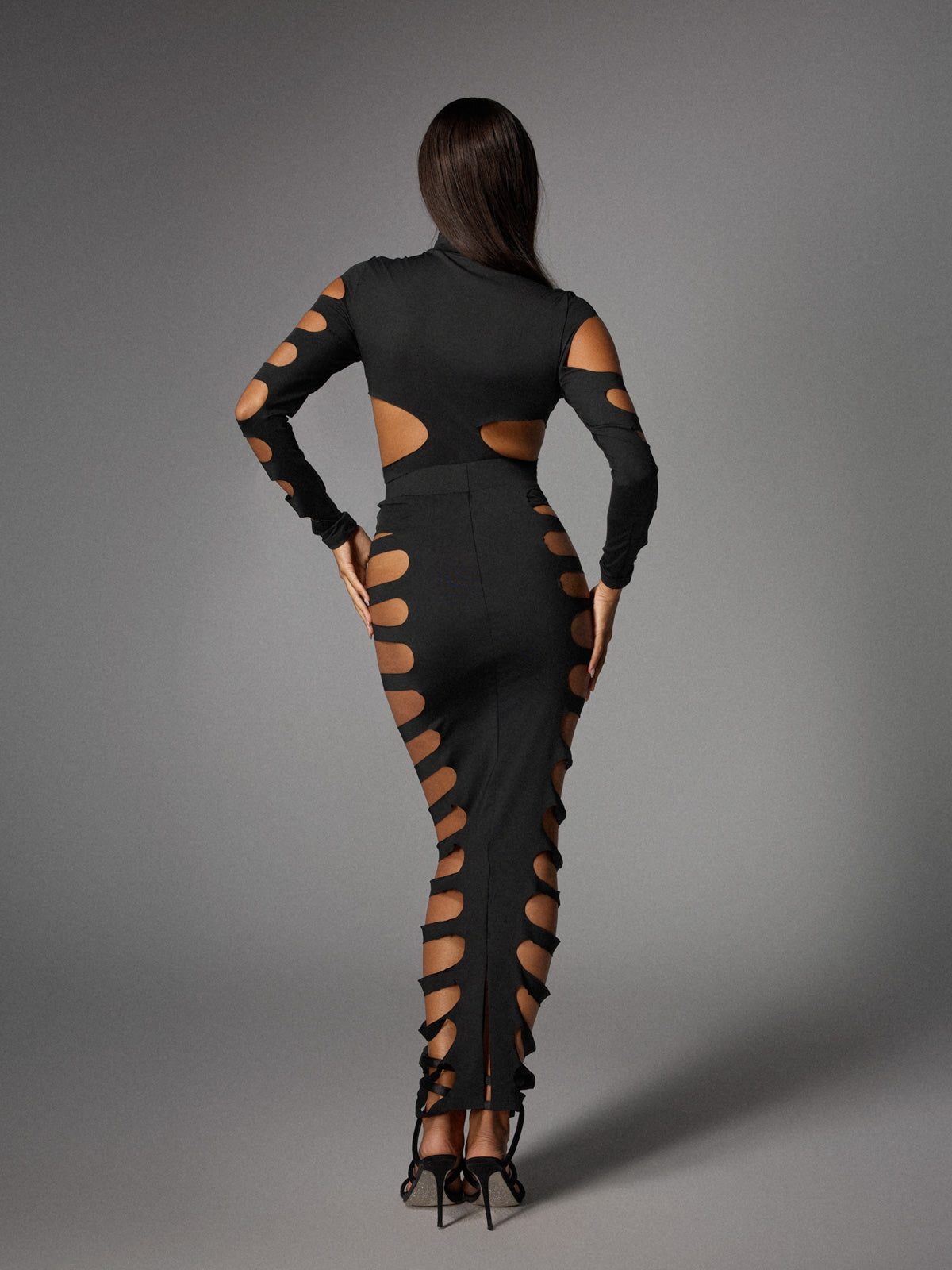 Introducing the Ceslee Long Sleeve Cutout Skirt Set in black! This versatile set will elevate your wardrobe with its unique cutout design and flattering fit. The long sleeves provide coverage while the skirt shows off your legs. Perfect for a night out or a special occasion, this set is a must-have for any fashion-forward individual.