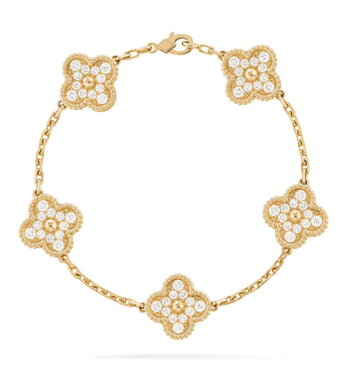 - Features five hand-set clover motifs in your choice of Mother of Pearl, Gold, or Malachite