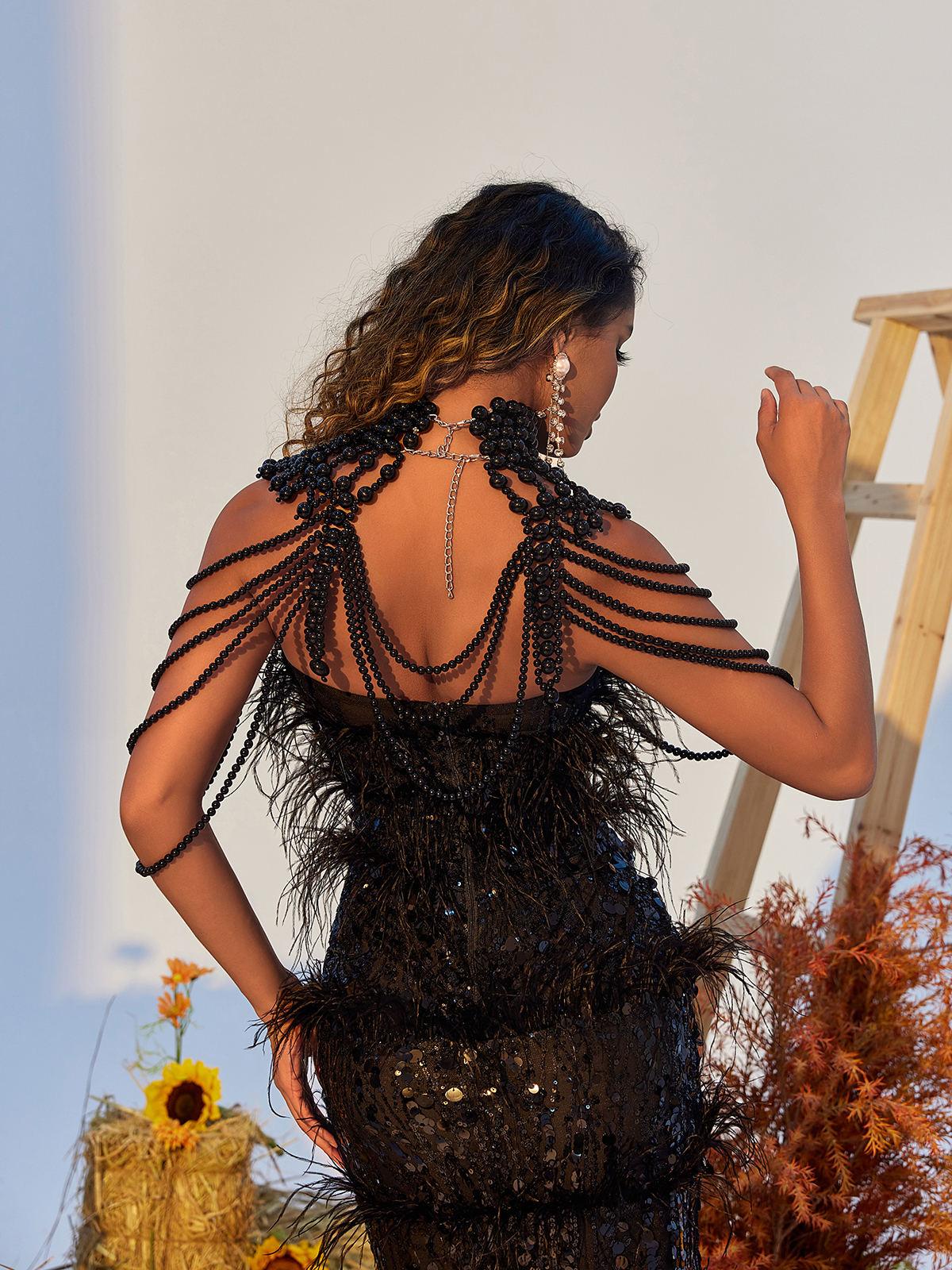 The Dani Pearl Body Chain Top in Black is an eye-catching piece. Crafted from beautiful pearls, it adds an elegant touch to any look. Featuring a lightweight design, it's perfect for styling any outfit.