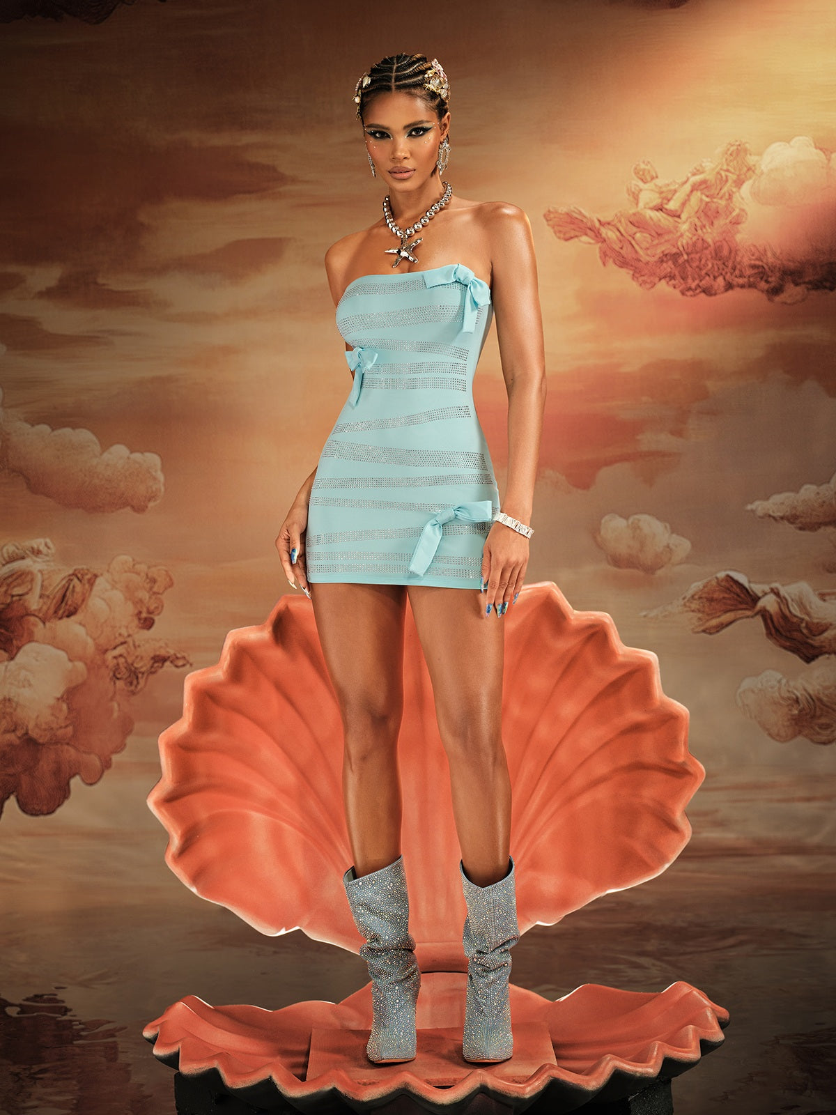 Jorunn Strapless Rhinestone Bow Mini Dress