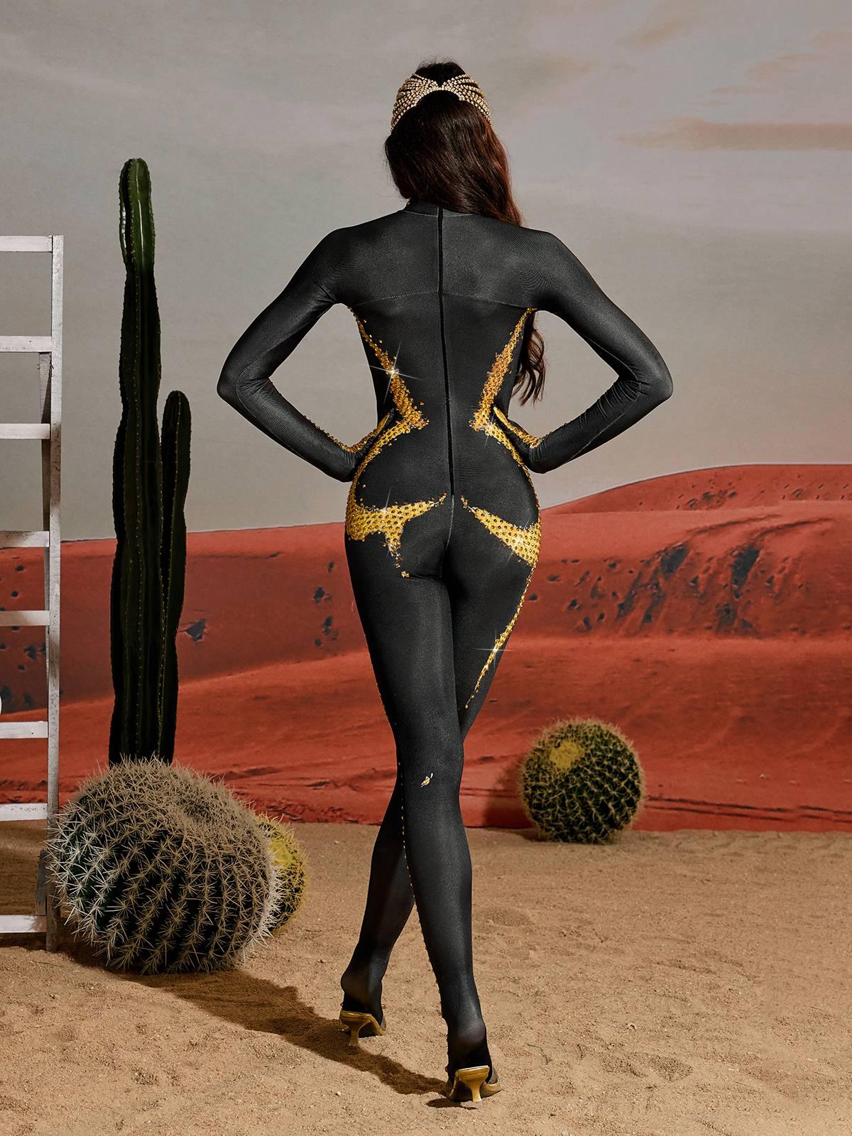 Radek Body Printed Rhinestone Gloves Jumpsuit In Gold